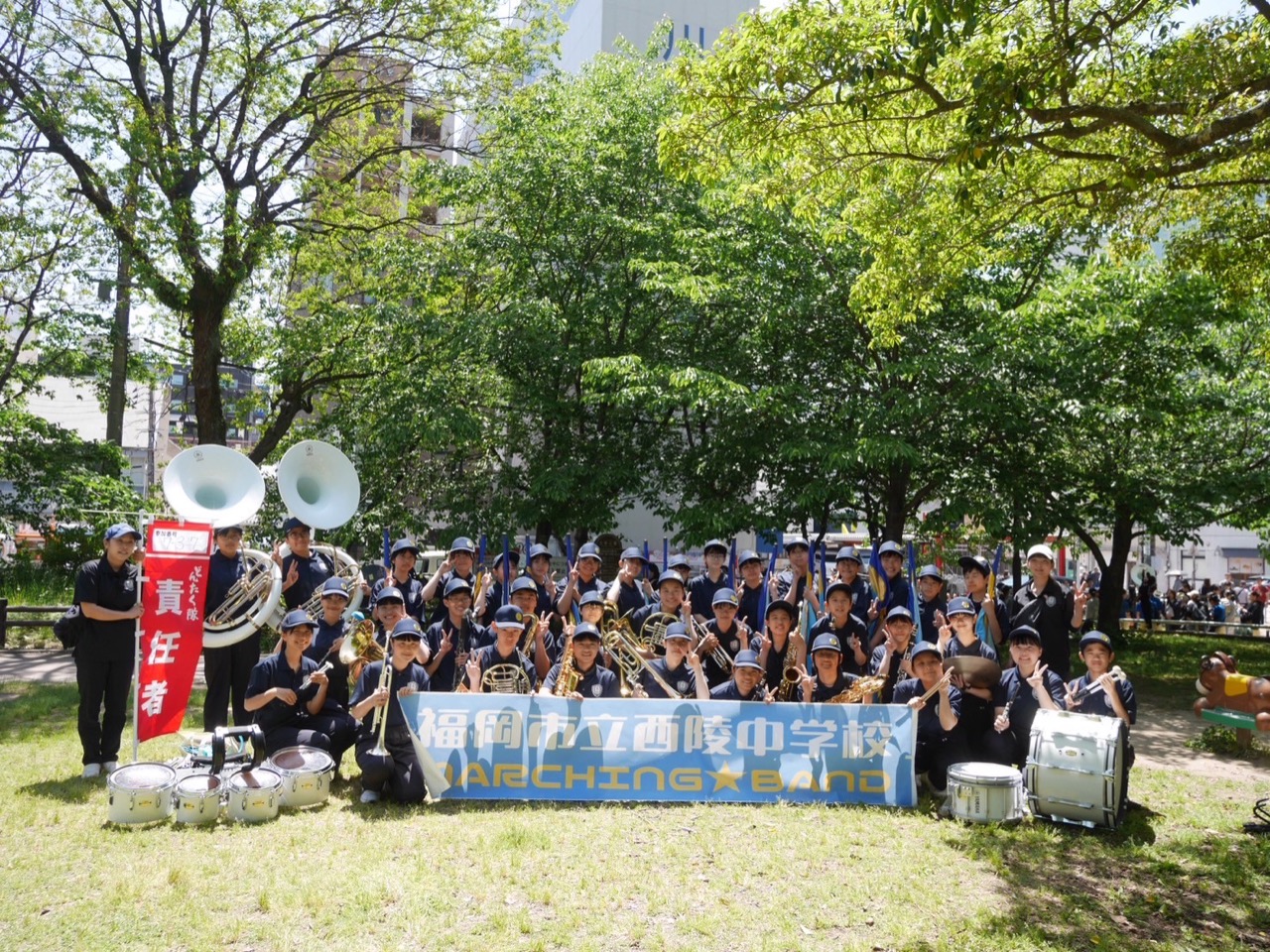 みなさんこんにちは!西陵中学校吹奏楽です。私たちの学校は福岡市西区に位置しており、校舎からは一面の海と能古島が見えます。今日は、どんたくでパレードが出来ることを部員一同楽しみにしていました。明るく元気よく最後まで一生懸命演奏するのでぜひご覧ください!