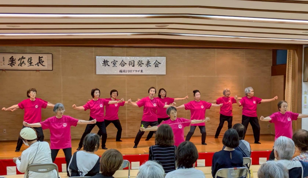 福岡100プラザ東(旧、老人福祉センター、東香園)の ソング&リズム体操の発表会での一場面です、みなさん年齢のことなんか忘れて、イキイキと活脳体操していますよ! どんたくはどの演舞にしようかな? 毎年楽しみにしています!