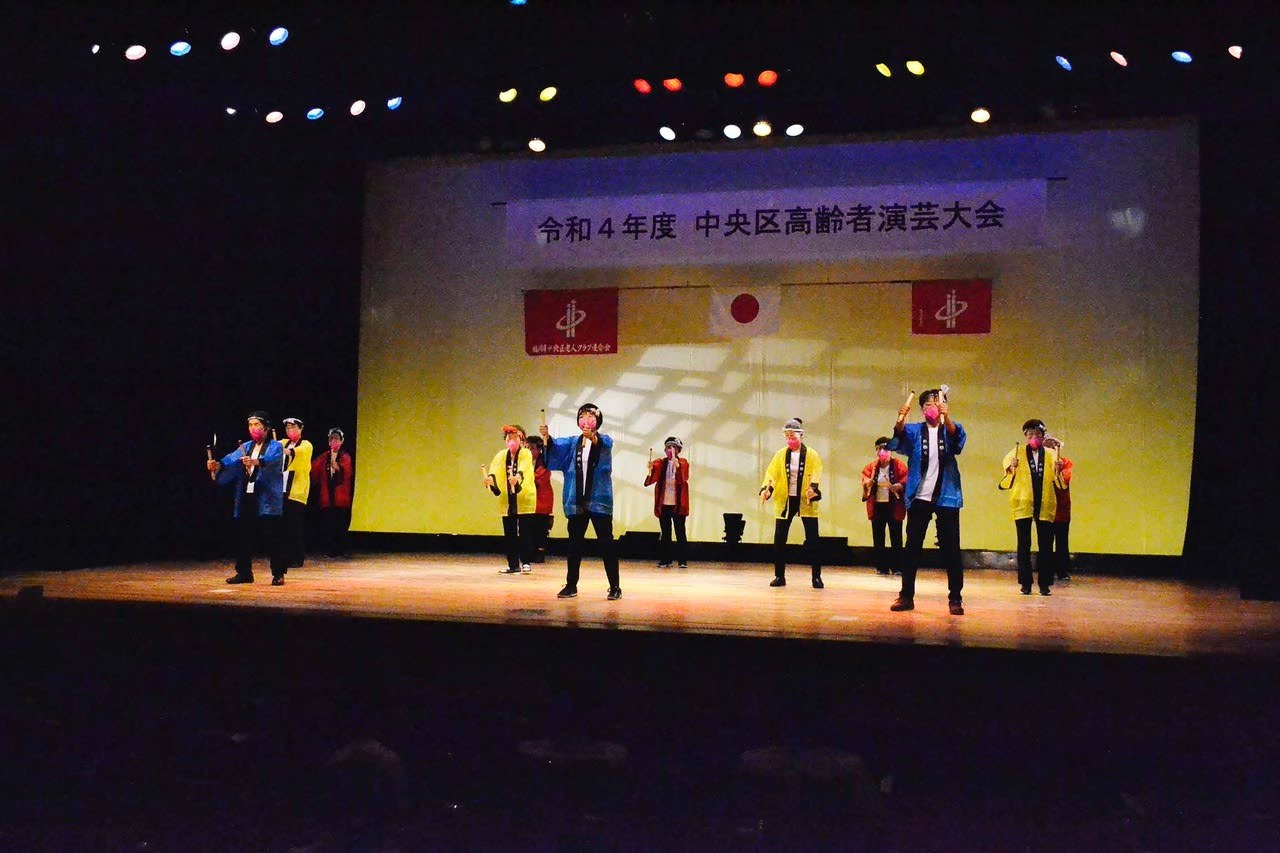 昨年7月13日、中央区高齢者演芸大会が中央市民センターで開催されました。 中央区内の校区で活動している総勢28のサークルが舞踏や詩吟などさまざまな演目を披露。簀子公民館のソング&リズム体操のメンバーも参加、日頃の練習の成果を存分に披露できたと大満足の1日でした!みんなで頑張りました〜のスマイル♪