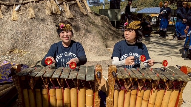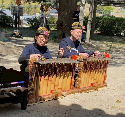 雲一つない晴天に恵まれ、ついに六所神社の春祭りの日を迎えました。 初めて参加させていただくので、どれくらい参拝の方が来られるのかわからず、ドキドキしながら“その時”を待っていました。 10時を過ぎたころから参拝者が増え始め、演奏開始時間の10時30分には50人くらい集まってくださいました。 およそ樹齢800年のご神木の根元に楽器を設置させていただき、まずは竹製打楽器リンディックの演奏から開始。 柔らかく心地いい音色が境内に響き渡り、参拝の方々の穏やかな笑顔と熱心に耳を傾けてくださっている様子にホッと一安心。 幸せな気持ちでカデさん・真由美さんの演奏にいつまでも聴き入っていたいけれど、次は私たちのグンデル。 二人ずつ2曲を演奏させていただきました。 「なんか楽しそうな音がするね」と、ご近所のお家からも急遽お越しいただき、日本の神社の神事でインドネシアの音楽を演奏することを受け入れてくださったことに感謝です。 神事のあとには、どんたくで披露するバラガンジュールの演奏が待っています・・・!